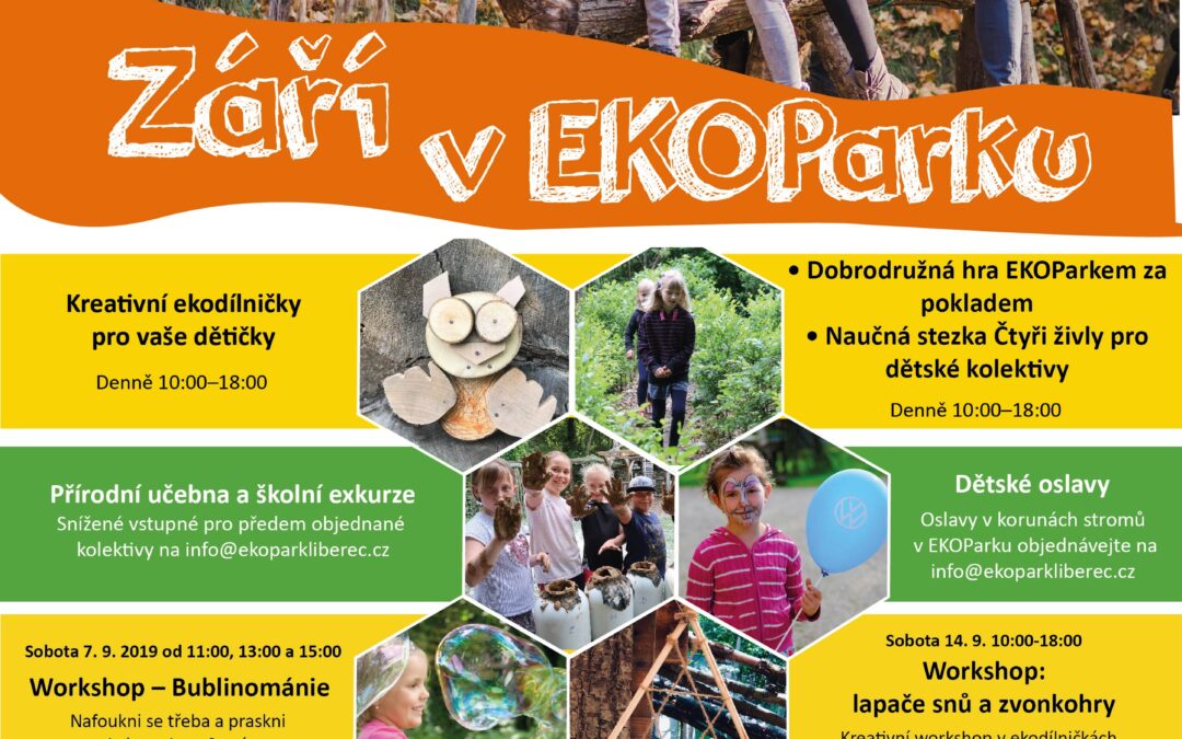 Září v našem EKOParku Zář 3, 2019 Dílničky a workshop 🎨🔨, stezka za pokladem💰💎, kamerunské kozy🐐🐐, kavárna Kopec v korunách stromů☕🌳, bublinománie🔵🔴, dětské oslavy🎁🎈. Rezervujte si u nás ubytování a užijte si krásné babí léto v Liberci 🙂