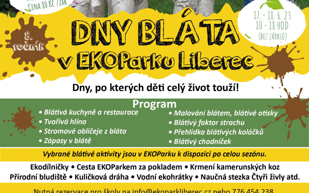 Při příležitosti mezinárodního DNE BLÁTA jsme pro Vás připravili interaktivní blátivý program. Akce se bude konat v prostorách Prvního volnočasového EKOParku Liberec. Pro ubytované hosty je vstup včetně aktivit ZDARMA.