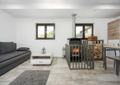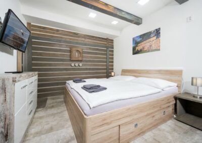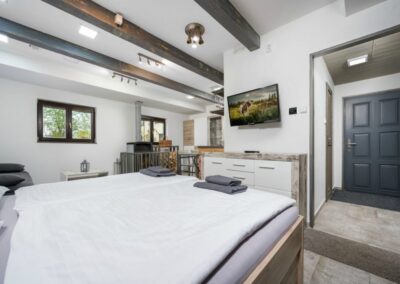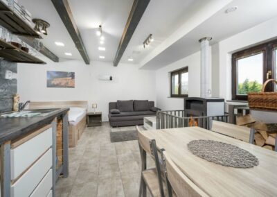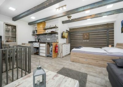 Apartmán AV1 je studiový apartmán umístěný v přízemí. Jedná se o útulný a moderně zařízený apartmán s krbem, plně vybavenou kuchyní, vlastní koupelnou se sprchovým koutem, manželskou postelí a rozkládací pohovkou pro 2 osoby.