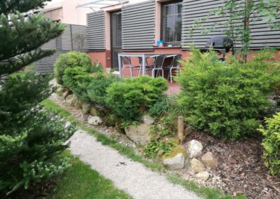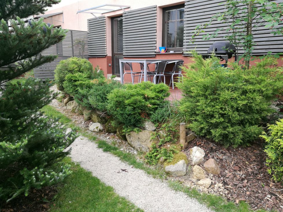 Vstup do apartmá je přímo z parkoviště a je oddělený od ostatních apartmánů. Jedná se o jediné apartmá, které má vstup francouzským oknem na zahradu a vlastní terasu s posezením a grilem, a díky tomu patří k nejoblíbenějšímu apartmá právě pro rodiny s dětmi.