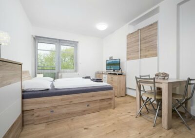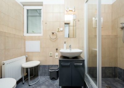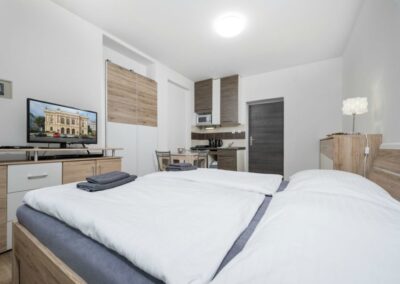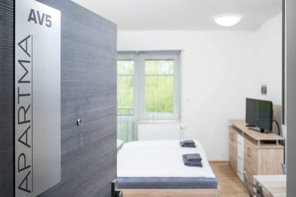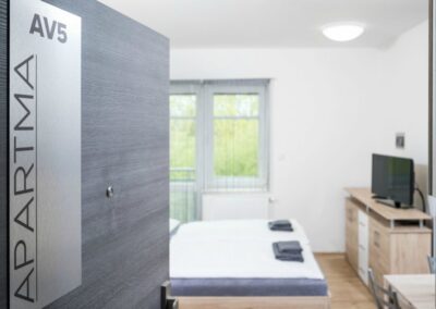 Apartmá AV5 se nachází v 1. patře a jedná se o menší apartmá s plně vybaveným kuchyňským koutem a vlastní externí koupelnou se sprchovým koutem a WC, která se nachází mimo pokoj, vzdálená však jen 10 kroků od apartmá.