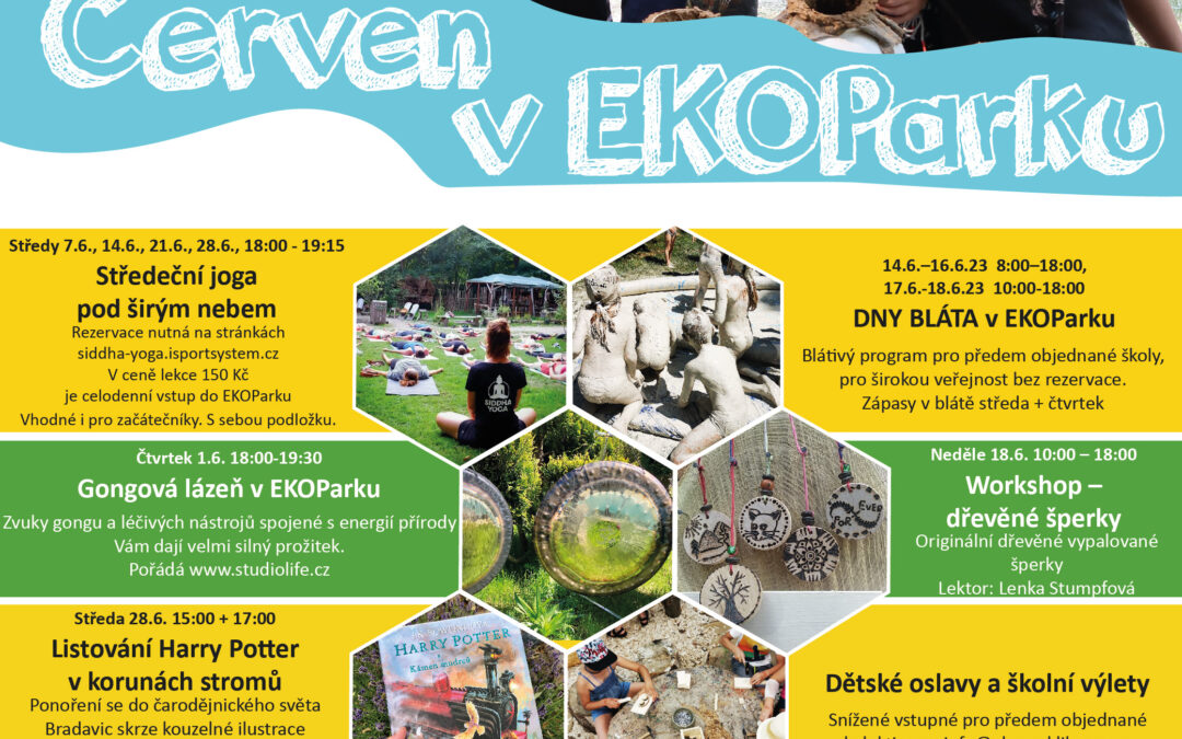 Jóga na čerstvém vzduchu, gongová lázeň, tvořivé dílničky, workshop vypalovaných šperků, listování Harry Potter a hlavně dny bláta, to je červen v EKOParku!